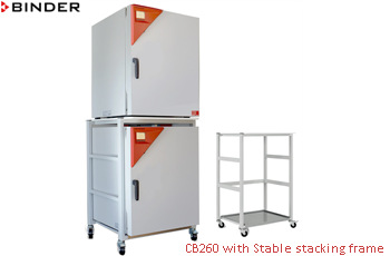 對(duì)于實(shí)驗(yàn)空間資源緊張的實(shí)驗(yàn)室,還可選配培養(yǎng)箱帶腳輪的落地安裝底座和箱體上下堆疊固定專(zhuān)用附件,將兩臺(tái)CB260 CO2培養(yǎng)箱疊放安裝使用。