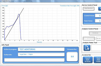 此外,通過(guò)隨機(jī)標(biāo)配DCA軟件,與預(yù)裝英文widows操作系統(tǒng)的外置電腦聯(lián)機(jī)后,可以實(shí)施顯示測(cè)試過(guò)程中人工對(duì)鼠尾施加拉力增長(zhǎng)速率曲線(target force rate)和測(cè)試數(shù)據(jù),有利于實(shí)驗(yàn)者按設(shè)定的拉力增長(zhǎng)曲線發(fā)力,使操作中施加拉力條件保持一致,防止拉力增加迅猛或者增長(zhǎng)過(guò)慢而影響測(cè)試數(shù)據(jù)的有效性。