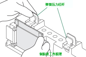 灌膠架頂部采用彈簧杠桿設(shè)計(jì),向后按壓手柄可抬高壓力杠桿,而釋放手柄后,壓力杠桿下壓厚玻璃板,使玻璃板-夾膠框與灌膠架平臺(tái)上的密封墊緊密接觸,實(shí)現(xiàn)有效密封,防止凝膠泄漏流失。