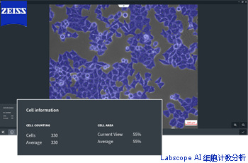 選擇Labscope應用程序,預先經(jīng)過訓練的AI 細胞融合度和AI 細胞計數(shù)模塊可不受限于細胞的形狀、大小以及細胞類型限制,自動分析細胞的數(shù)量和細胞的覆蓋面積,提供即時、定量的可視化結果。
