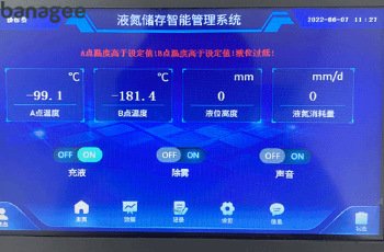 7寸操控屏持續(xù)顯示系統(tǒng)實(shí)時(shí)顯示液氮消耗量,箱體內(nèi)真實(shí)液位,高/低位液位報(bào)警值。
